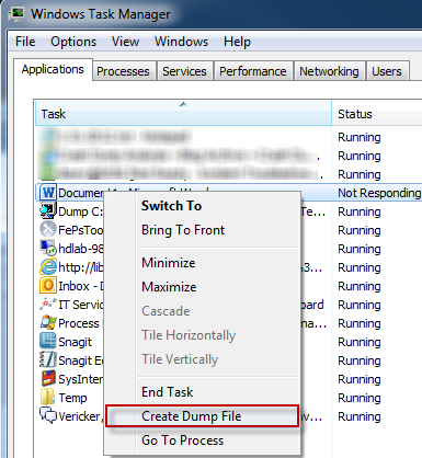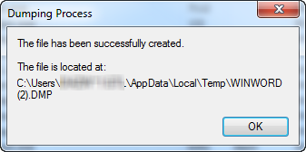 After loading up Word today, I noticed it would become hung each time I went to the Insert tab. I was able to reproduce the behavior after killing the process and starting it up again. To troubleshoot, I started by going to the Windows 7 Task Manager, right-clicking, and selecting Create Dump File from the context menu: