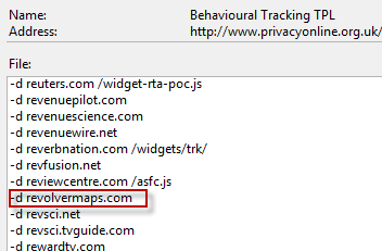 To verify that the Revolver Map was being blocked on my site via a TPL, I examined the lists by going to the Internet Options sprocket > Safety > Tracking Protection > Selecting the Behavioural Tracking TPL > More information (this can also be done from Internet Options > Program > Manage Add-ons). I could, in fact, see that revolvermaps.com was on the list: