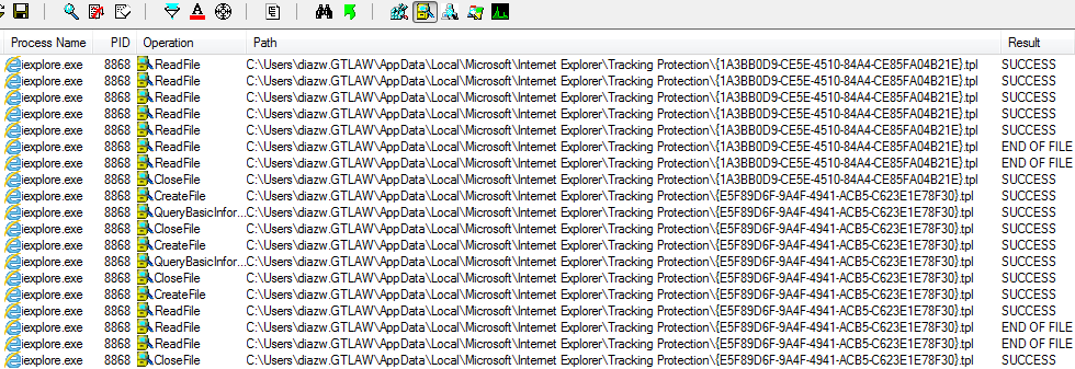 This stirred my curiosity a bit and I was decided to see how the internals of this feature work. The actual downloaded TPL lists are text files written to C:\Users\username\AppData\Local\Microsoft\Internet Explorer\Tracking Protection\{SomeGUID}. Each time you start Internet Explorer, the TPL lists are read from this location and this is how IE decides which domains to filter content. You can see this with Process Monitor: