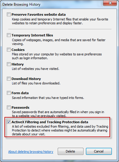 This has the effect of removing the DWORD value created earlier, e.g. windowsexplored.com, from the Tracking Protection Exceptions registry key. Alternatively, you can remove all exceptions at once by going to the Internet Options, selecting Delete under Browsing History and checking the option for ActiveX Filtering and Tracking Protection Data, which actually deletes the registry key altogether, not just the individual DWORD exceptions:
