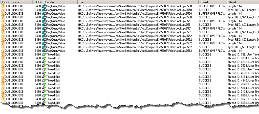 Instead, I turned to Process Monitor; perhaps it might reveal what Outlook was doing just before it crashed and give me some important clues. I set a filter to monitor only outlook.exe, dragged an item into the document management space in Outlook and waited for it to crash after clicking Save. Afterwards, I scrolled to end of the log, working my way up. I also added a filter to only include registry activity and then process and thread activity so I could quickly see where Outlook was crashing: ![]()