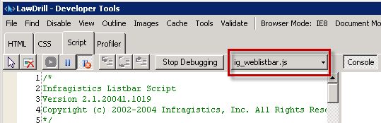 This alone is not going to help me. I need to visit the LawDrill site from a workstation where it is working and run the developer tools and compare. This turns out to be the key; there are two different scripts being run respectively on problem workstation and the working one:
