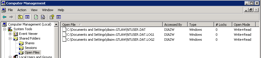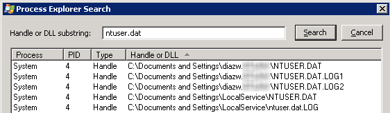 Normally, a reboot will resolve this issue. But that wouldn’t be any fun. Additionally, we run the User Hive Profile Cleanup service (XP workstations)* to mitigate issues where application or service processes remains hooked to user’s registry, NTUSER.DAT and UsrClass.dat, after log off so I was interested to see what was hooked to either of these files.