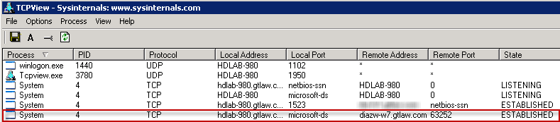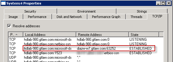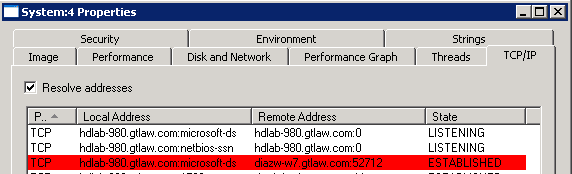 The System process has locked the user’s registry file (this is a recreation so I am the user). Think of the System process in this case as a misnomer for a remote process. Finding who has the handle on it is a simple matter of open the process properties and going to the TCP/IP tab: