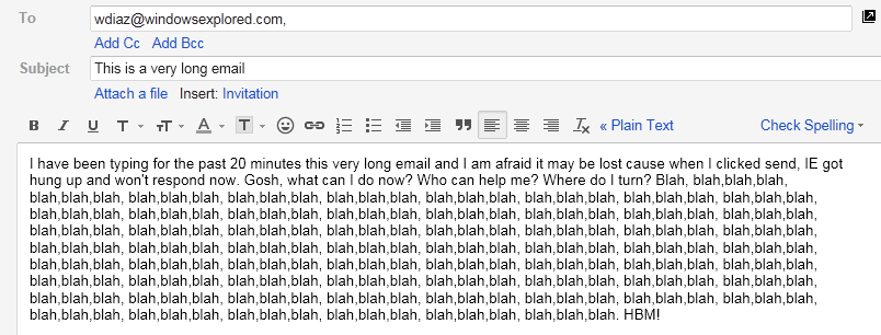 A couple weeks ago a co-worker asked me if it was possible to recover text from a hung application. The user had spent a good amount of time typing into text field and upon trying to submit the information, IE became hung and would not recover. The user didn’t want to have to retype everything from scratch again. The short answer to this is yes. The long answer is “Yes, if you can be patient.” I have never actually needed to perform this myself because it’s not always that practical and, to be honest, the task can be somewhat tedious. But if you really need to recover text and Word didn’t auto-recover or Outlook lost the draft after you clicked send, or IE is in the process of a “GUI crash”, then turn to the power of the dump.