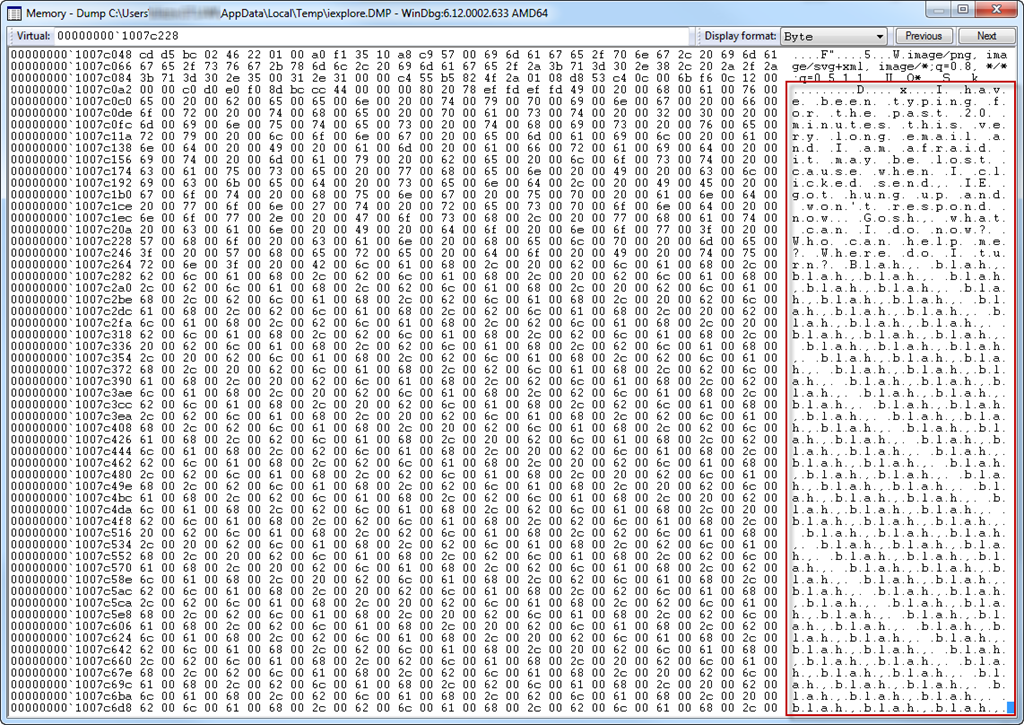 There’s many fragments and I need to examine one of these address spaces until I find the body of the message. The easiest way to do this is to use the Memory window in WinDbg via the View menu or from the toolbar. I randomly choose any address space above (00000000`1007c228) and copy it into the Virtual address bar to find the message body (a little scrolling may be required depending on the position of the text you are searching for):