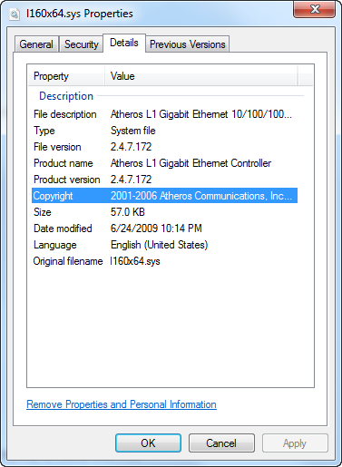 0: kd> lmvm l160x64 start end module name fffff880`11dcc000 fffff880`11dde000 l160x64 (pdb symbols) c:\symcache\l160x64.pdb\C94FF76A967D498A9994CF11EEF7364C1\l160x64.pdb Loaded symbol image file: l160x64.sys Image path: \SystemRoot\system32\DRIVERS\l160x64.sys Image name: l160x64.sys Timestamp: Fri Jun 19 09:15:45 2009 (4A3B8F81) CheckSum: 00017BEF ImageSize: 00012000 Translations: 0000.04b0 0000.04e4 0409.04b0 0409.04e4