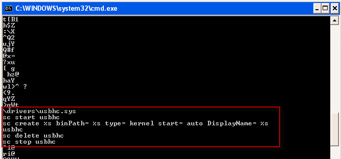 A single file, or payload, is extracted from the executable, usbhc.sys. This makes sense since K8h0pp.exe is 32 KB and its payload, usbhc.sys, is 31 KB. The rest is just code that leverages sc.exe to create usbhc.sys as a system service and its accompanying keys and values: