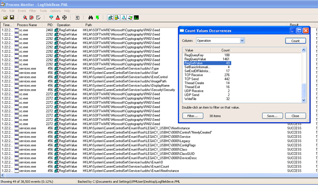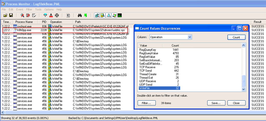 The last step was to isolate the exe on a virtual machine2 to see what it does to the system beside creating a service. The tool of choice here is Process Monitor. I’m only interested in seeing what files are being written to the system as well as what reg keys are being created or modified. The quickest way to do this is to use the Tools > Count Occurrence feature and focus on Operations.