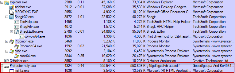 Start Process Explorer or some other non-Windows process utility. You might need to rename it as in my case. Kill the protector-.exe process or any other suspicious process. The description is enough to give it away.