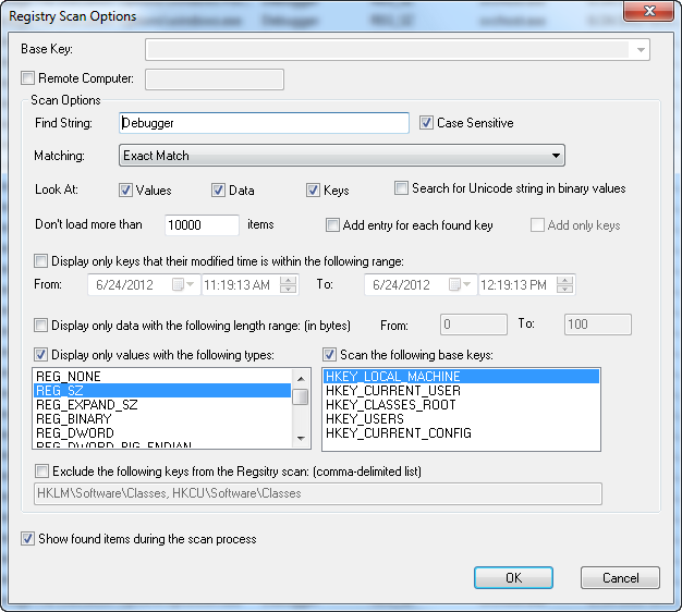 Then focus on the reg path, select all, and Delete. You will need to run RegScanner as Administrator. Another option to run a script that cleans up all reg keys in Image File Execution Options with REG_SZ string Debugger. -