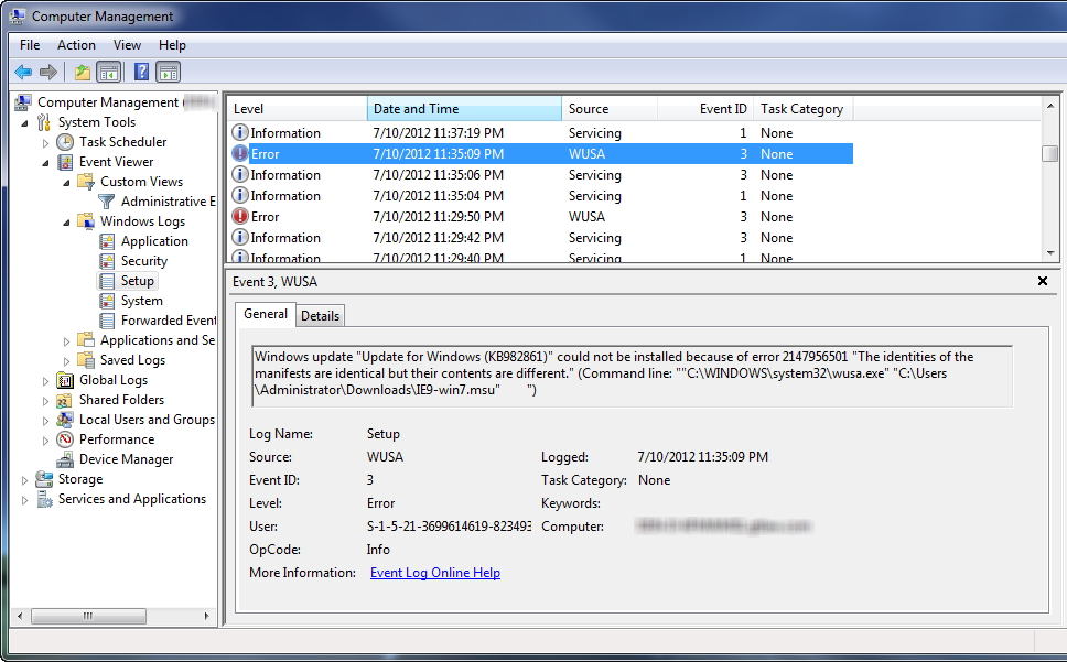 This can be for any number of reasons, the most of which are covered in this Microsoft KB: Troubleshoot problems when you cannot install Internet Explorer 9. I wasn’t so lucky, however, and was left scratching my head. Maybe the Windows Event Viewer might reveal something more verbose.