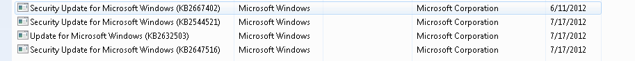 Looking up the error status code, we see the same verbose as the WUSA error encountered earlier: “ERROR_SXS_MANIFEST_IDENTITY_SAME_BUT_CONTENTS_DIFFERENT. The identities of the manifests are identical but their contents are different.” The security fix I applied in the first case didn’t help. Instead, I decided to look at any recently installed updates on the workstation. This can be done via Control Panel > Programs > Programs and Features > Installed Updates. I focused on Microsoft Windows updates and found three installed updates after the removal of IE 9.
