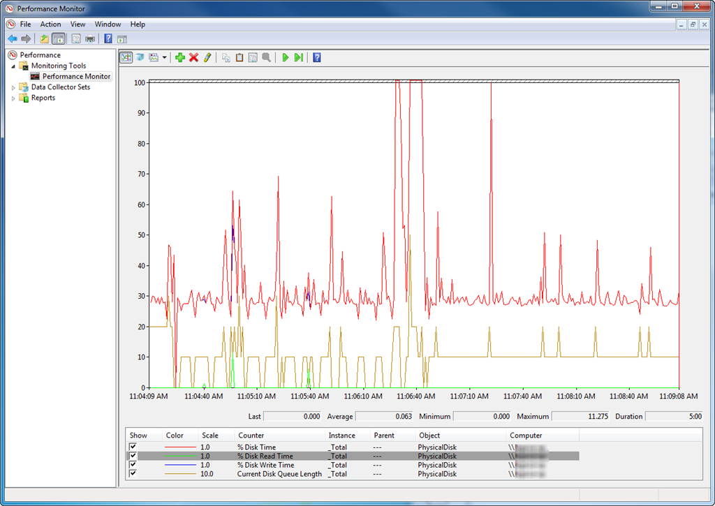 In the past week or so a couple workstations were brought to my attention in different offices that were exhibiting poor performance. Suspicious of disk bottlenecks, I remotely connected perfmon physical disk counters to both and saw a excessive time spent writing to the disk and the current disk queue length spiking when the workstations were logged on but idle. Here is a snapshot of both PCs: