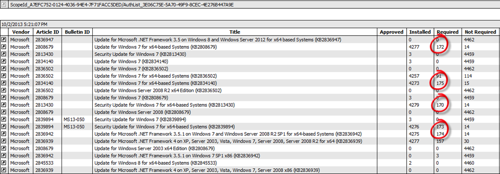 While browsing various reports for workstation compliancy, I noticed that several reports and/or updates failed to install on a large number of computers. Although we don’t expect complete 100% compliancy with thousands of workstation in our environment, there was some sort of mystery going on here because many of the updates that failed to install were along the same computers, i.e. they were not just random computers across the various reports. For example, below is a report for various updates that were missing from generally the same number of computers and computer names: