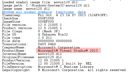 Running lmvm msvcr120 command indicates this belongs to the Microsoft C++ 2013 visual runtime library: