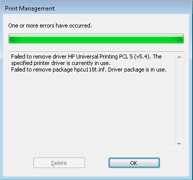 After seeing another rash of this outbreak in another office, I encountered issues trying to remove the HP Universal Printing PCL 5 (v5.4) package from the Print Management console: