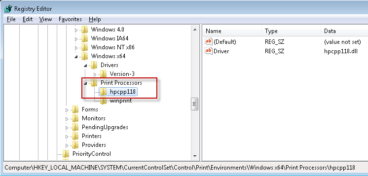 To try and determine what was causing this to occur, I asked the local office tech to contact me when he encountered another user with the same issue so I could compare the drivers in spool\driver and the file repository folders on the problem workstation with those on a behaving workstation for the HP universal print driver package but everything looked identical. Next, I compared the registry key of the two workstations and spotted the problem.