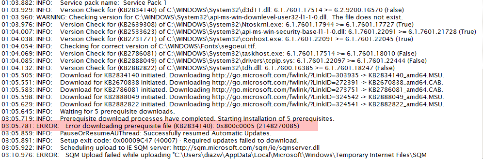 There has been some chatter about the Internet Explorer 11 MSI that is generated from the IEAK failing while the EXE is able to run successfully. I ran into this myself last week while trying to manually execute the package. The IE11_main.log always showed the same error: “ERROR:   Error downloading prerequisite file (KB2834140): 0x800c0005 (2148270085)